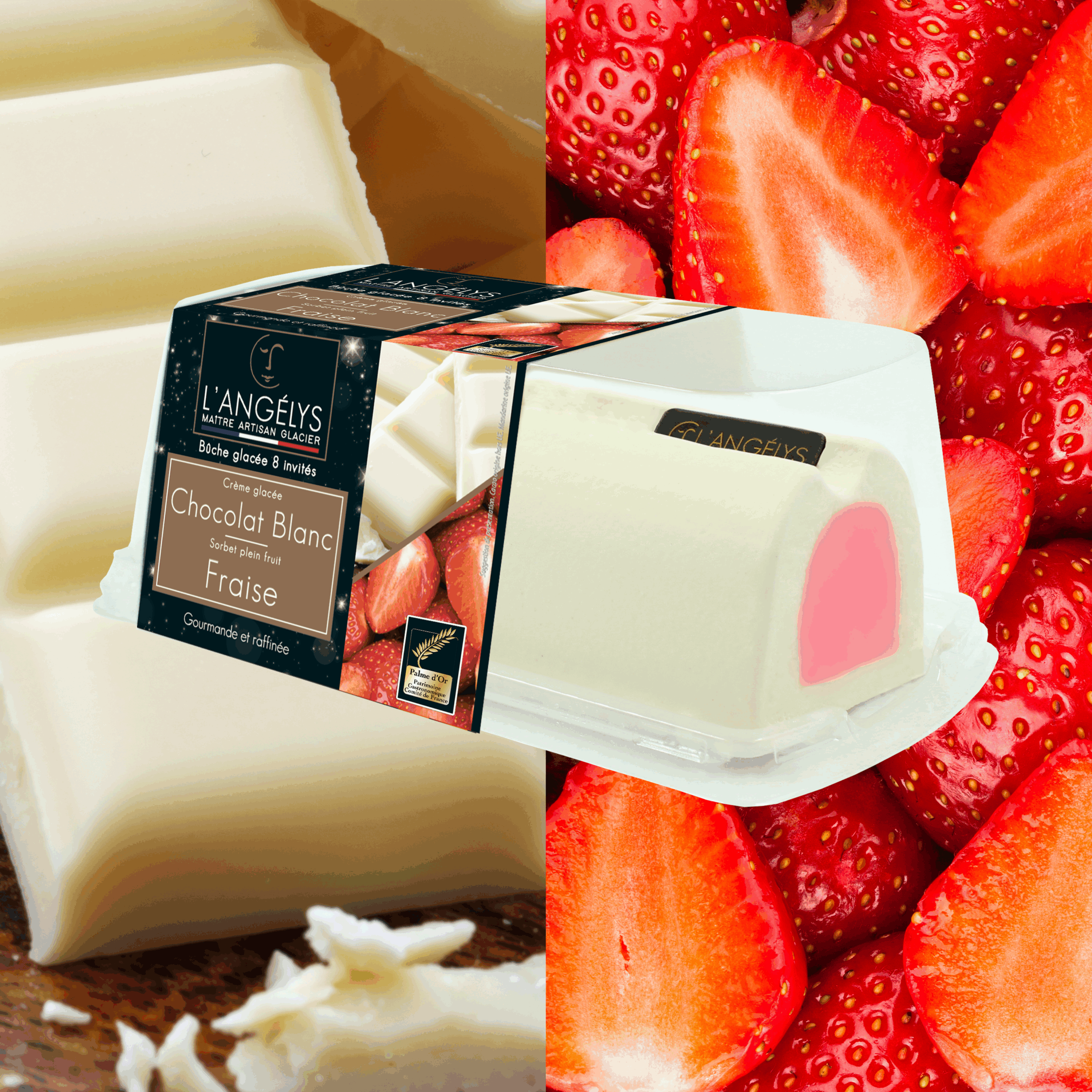 Pour les fêtes de fin d’année, dégustez cette délicieuse bûche gourmande à la crème glacée chocolat blanc et sorbet plein fruit fraise. Cette bûche artisanale est fabriquée dans notre atelier en Charente-Maritime.