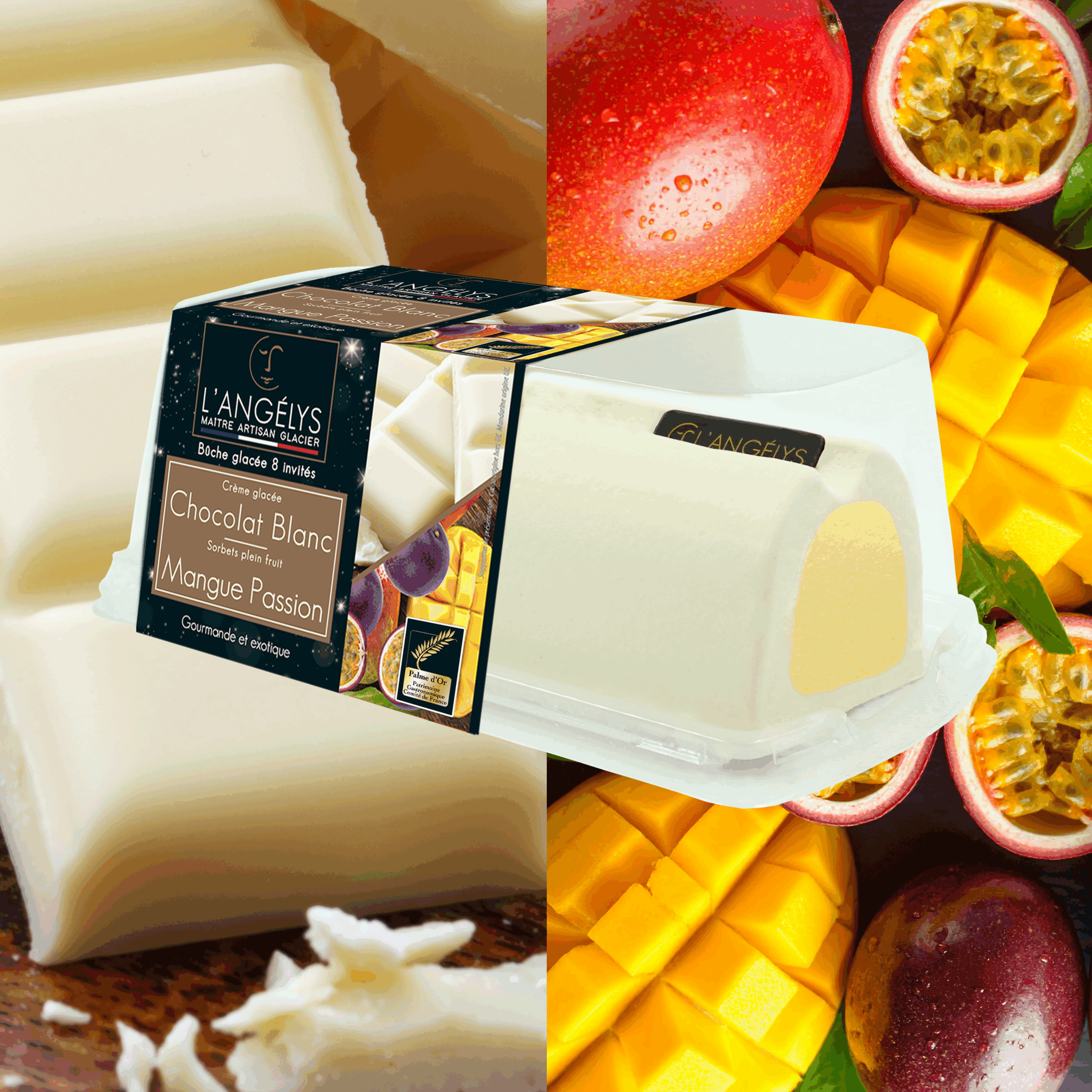 Crème glacée chocolat blanc 59 % : LAIT écrémé réhydraté, chocolat blanc1 14 % (sucre, beurre de cacao, LAIT entier en poudre, LAIT écrémé en poudre, émulsifiant (lécithine de colza), vanille Bourbon en gousse), CREME, sucre, eau, émulsifiants (mono- et diglycérides d'acides gras (origine colza)), stabilisants (farine de graines de caroube, gomme guar). Sorbet plein fruit mangue et fruit de la passion 39 % : Mangue1 18 %, sucre, eau, fruit de la passion1 4 %, fibres de maïs, protéine de pomme de terre, stabilisants (farine de graines de caroube, pectine), jus de citron. Coulis de fruits exotiques (mangue, fruit de la passion, sucre, stabilisant (pectine)), décor chocolat (cacao, sucre, beurre de cacao, émulsifiant (lécithine de tournesol), colorant (curcumine)). 1Origine hors UE.