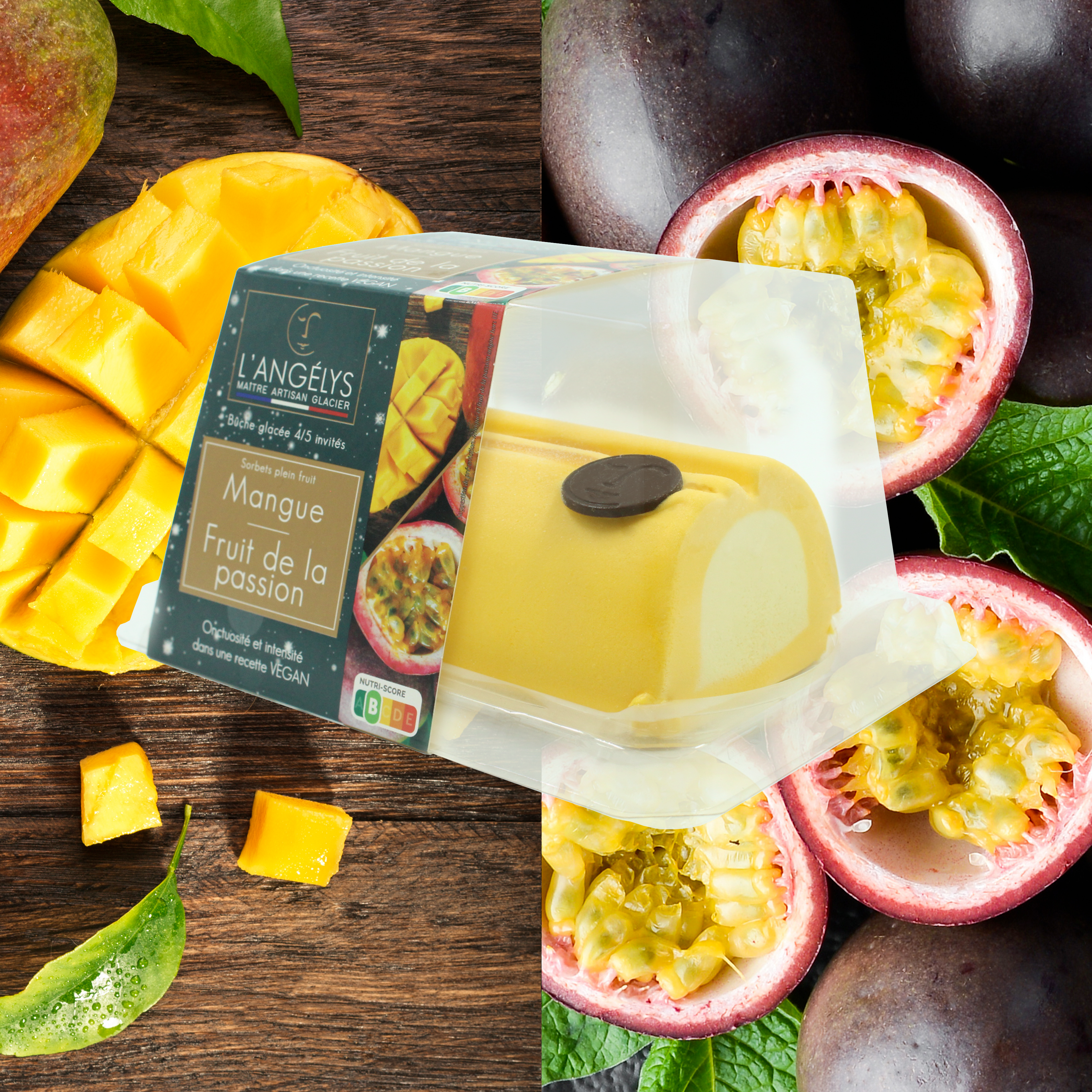 Mangue¹ 37,5 %, eau, sucre, fruit de la passion¹ 17,8 %, fibres de maïs, protéine de pomme de terre, stabilisants (pectine, farine de graines de caroube), jus de citron, cacao, beurre de cacao, émulsifiant (lécithine de tournesol), extrait naturel de vanille, colorant (curcumine).¹Origine hors UE.