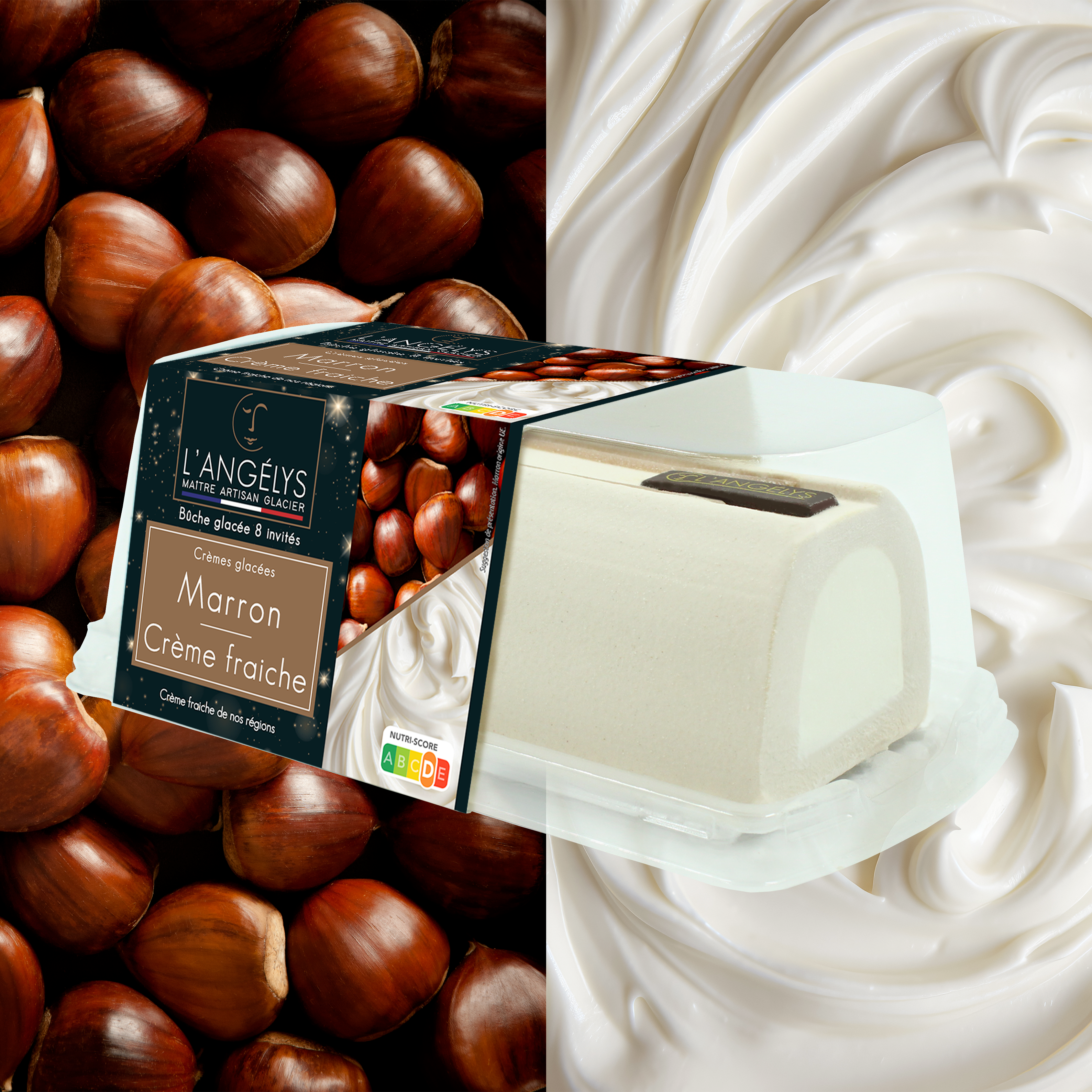 Pour les fêtes de fin d’année, dégustez cette délicieuse bûche gourmande à la crème glacée Marrons et d’une crème glacée Crème fraîche. Cette bûche artisanale est fabriquée dans notre atelier en Charente-Maritime.